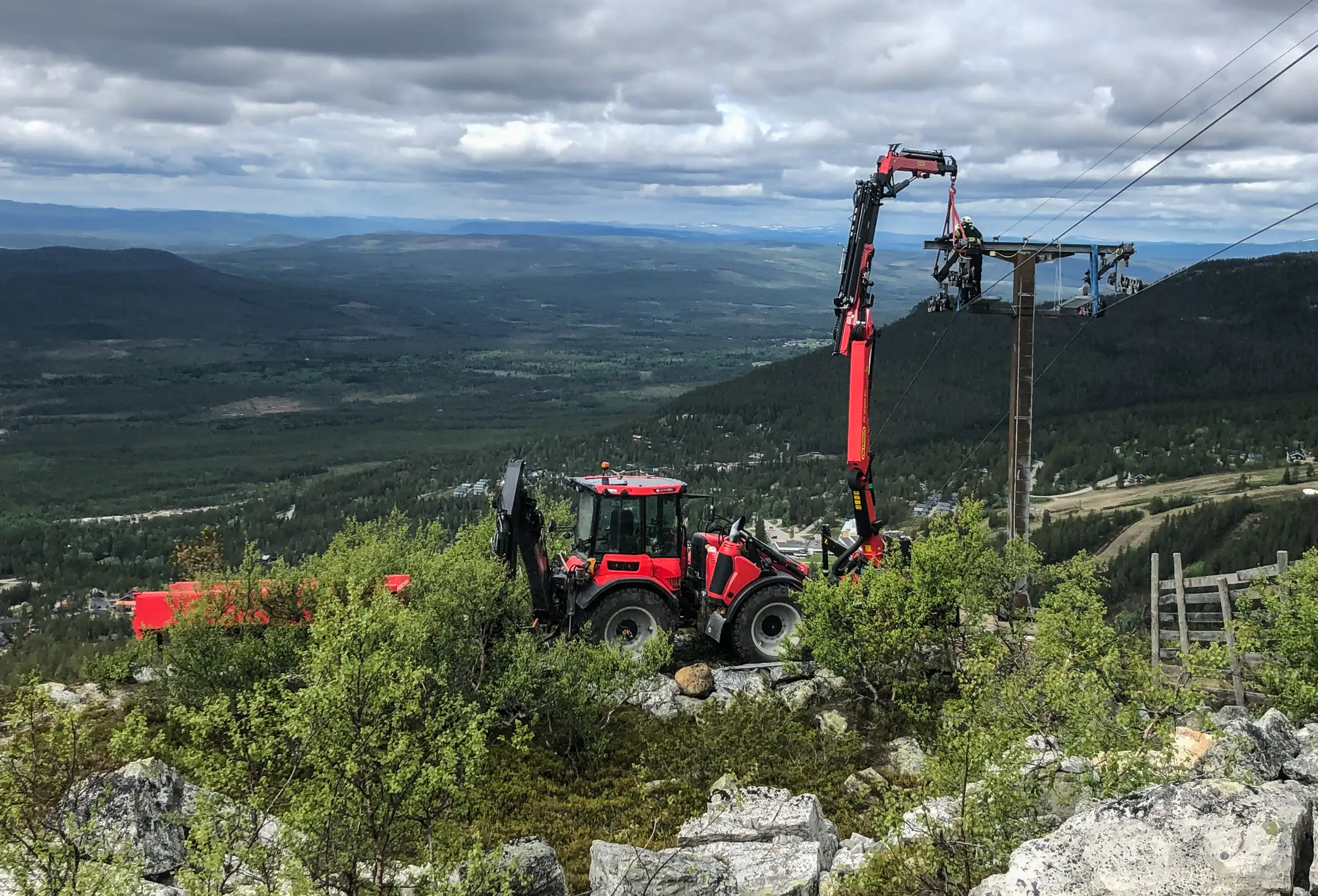 "We use the Palfinger with a basket to send as little weight as possible up high for different service jobs. I put the front loader to equilibrium to keep the balance and stability, whether we are on a slope or not. If the hill is steep, you also do not have to stand in the middle of the ropes because the poles are on the side of the slope. We can hoist the basket approximately 24 meters into the air. I can guarantee butterflies in the stomach when you look down from up there!”